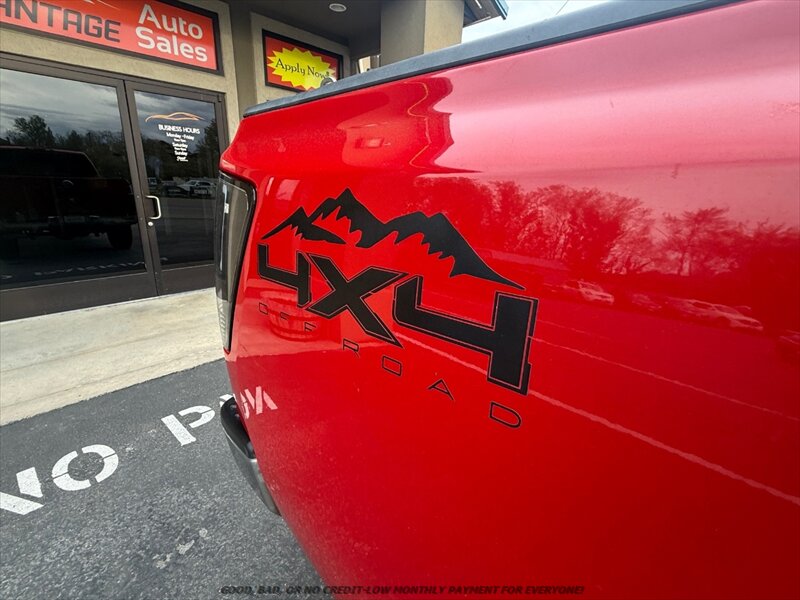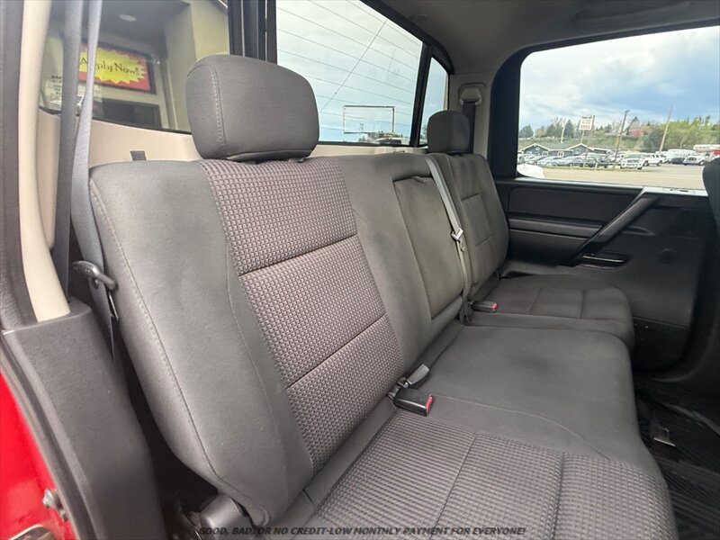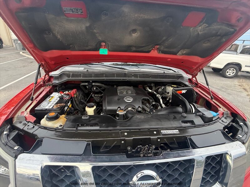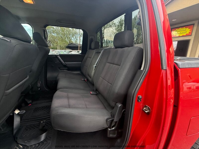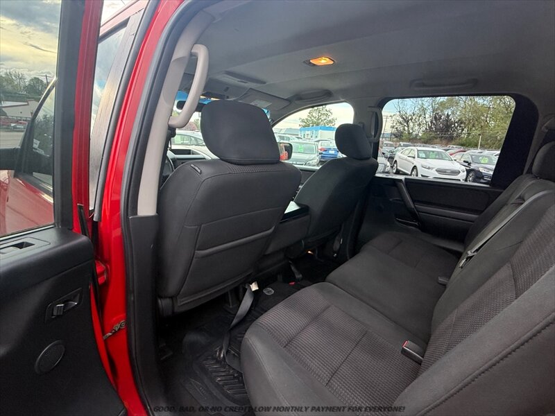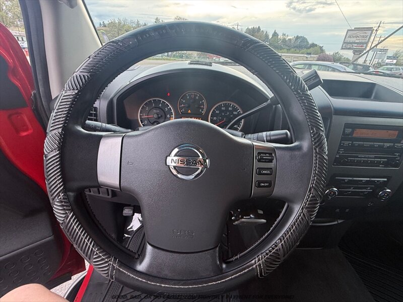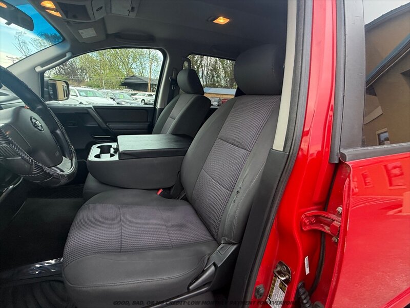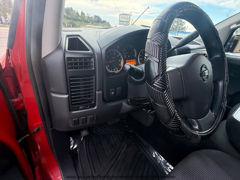 2010 Nissan Titan SE – Bright red exterior with comfortable black cloth interior. This SE comes with the factory-equipped V8 and automatic transmission, power windows and locks with remote keyless entry, air conditioning, cruise control, tilt steering, steering-wheel audio controls and an AM/FM/CD stereo with auxiliary input. Safety and convenience features typically include ABS brakes, airbags (front and side), stability/traction control, alloy wheels, fog lights and a towing-ready setup with hitch receiver. Excellent overall condition, under 153,000 miles (averaging less than 9,000 miles/year).