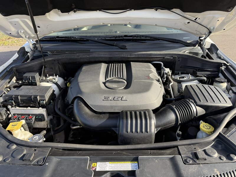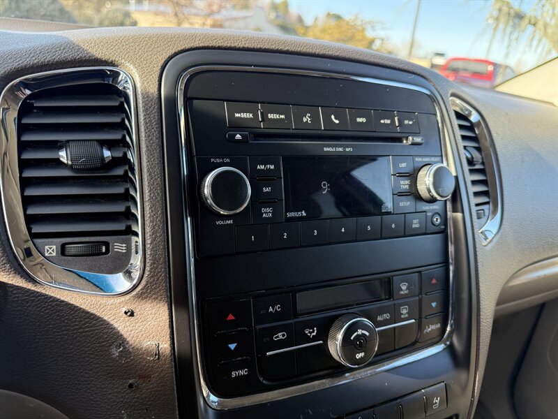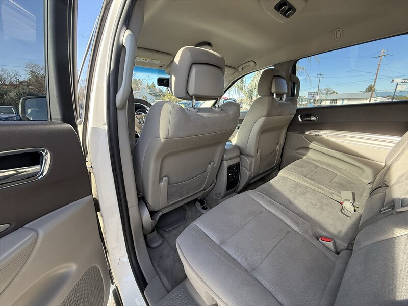 2011 Dodge Durango Express in Bright Silver Metallic Clear Coat with Black cloth interior. Powered by the 3.6L V6 (290 hp, 260 lb-ft) with a 5-speed automatic, EPA-rated about 16 MPG city / 22 MPG highway. Factory features include seating for seven with 60/40 second-row and 50/50 fold-flat third-row, cloth upholstery, air conditioning, cruise control, tilt steering, power windows and door locks, remote keyless entry, AM/FM/CD/MP3 stereo with auxiliary input, 17-inch wheels and full-size spare, plus safety equipment such as ABS, traction and stability control, front side and full-length side-curtain airbags, and tire pressure monitoring. This vehicle is in excellent overall condition.