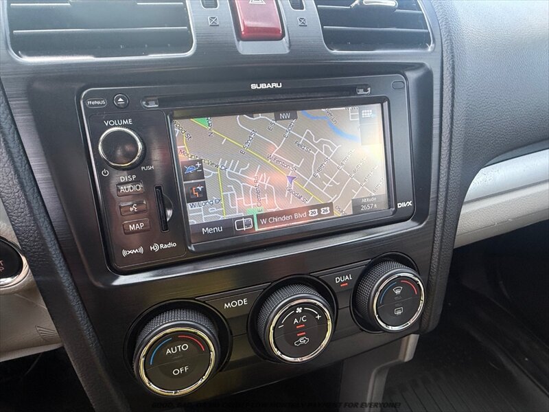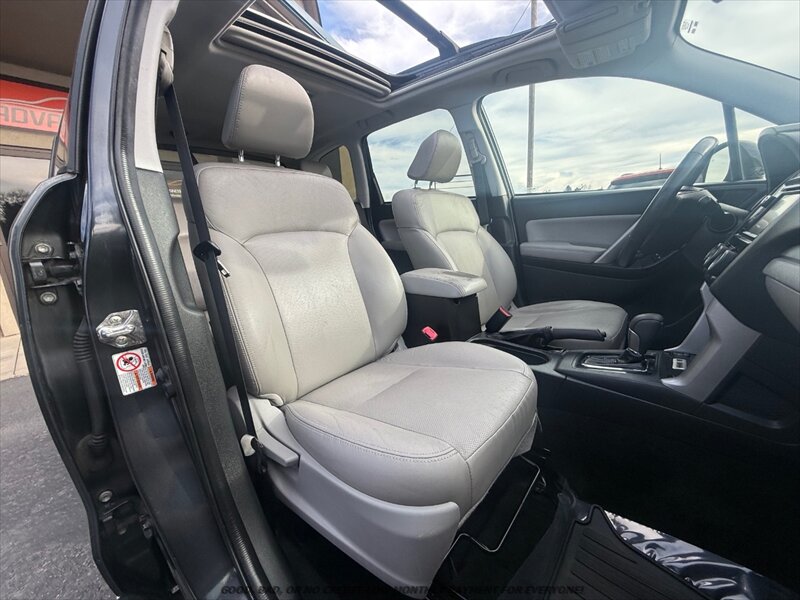 2015 Subaru Forester 2.5i Touring — Dark Gray Metallic exterior with Gray leather interior. Powered by a 2.5L H4 170 hp, 174 ft·lb engine paired to Subaru’s Lineartronic CVT and Symmetrical All-Wheel Drive, this Forester returns about 24 MPG city / 32 MPG highway and is in excellent overall condition. Factory features include ABS with brake assist, stability and traction control, multiple airbags and TPMS; leather-trimmed heated front seats with power driver adjustments, dual-zone automatic climate control, cruise control, tilt/telescoping leather steering wheel with audio controls, Bluetooth hands-free/audio streaming, AM/FM/USB/AUX inputs, rearview camera, fog lights, alloy wheels and roof rails — everything designed for comfortable, confident driving.