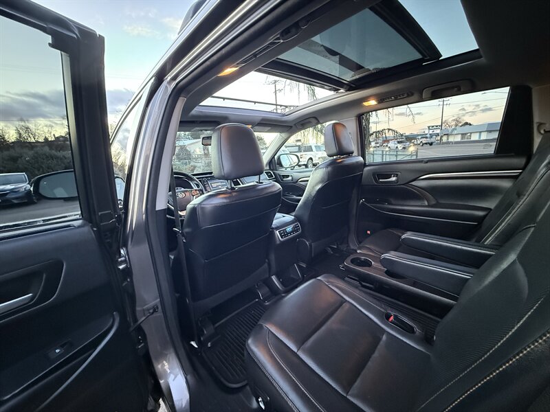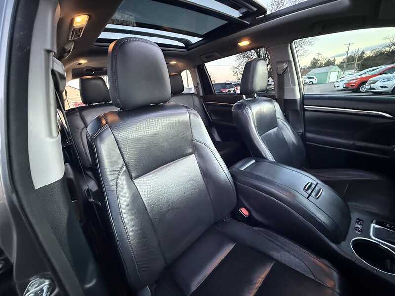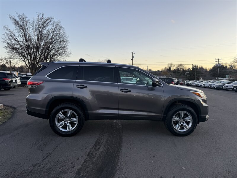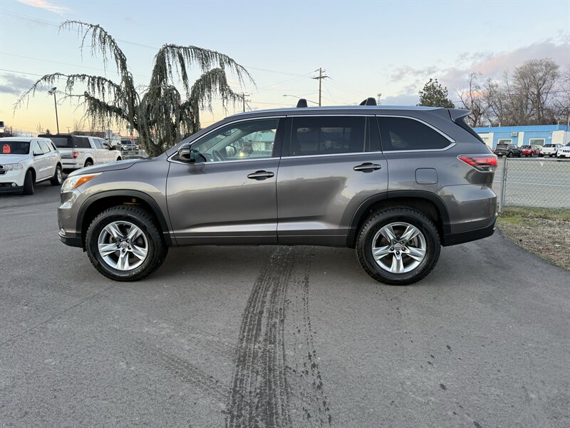 2015 Toyota Highlander Limited Platinum — Silver Sky Metallic exterior with a Black interior. Powered by a 3.5L V6 (270 hp / 248 lb-ft), this top-trim SUV delivers comfortable seating for up to seven, excellent highway manners and an EPA rating of 18 MPG city / 24 MPG highway. Factory features include leather-trimmed heated and ventilated front seats, power-adjustable driver seat with memory, power tilt/slide moonroof, hands-free power liftgate, tri-zone automatic climate control, Entune touchscreen with navigation, Bluetooth/USB/AUX, premium audio, rearview camera, blind-spot monitor with rear cross-traffic alert, parking sensors, keyless entry with push-button start, roof rails, alloy wheels and a full suite of safety systems (ABS, traction and stability control, multiple airbags). The Platinum Package brings top-level convenience and luxury upgrades. This vehicle is in excellent overall condition — ready to enjoy!