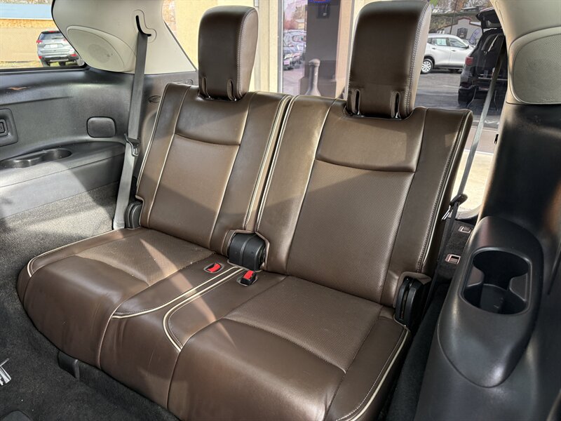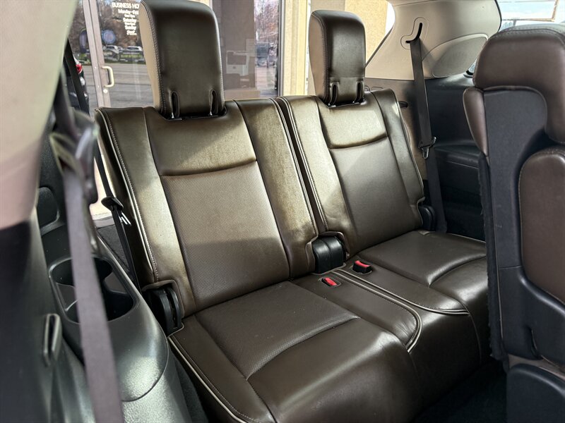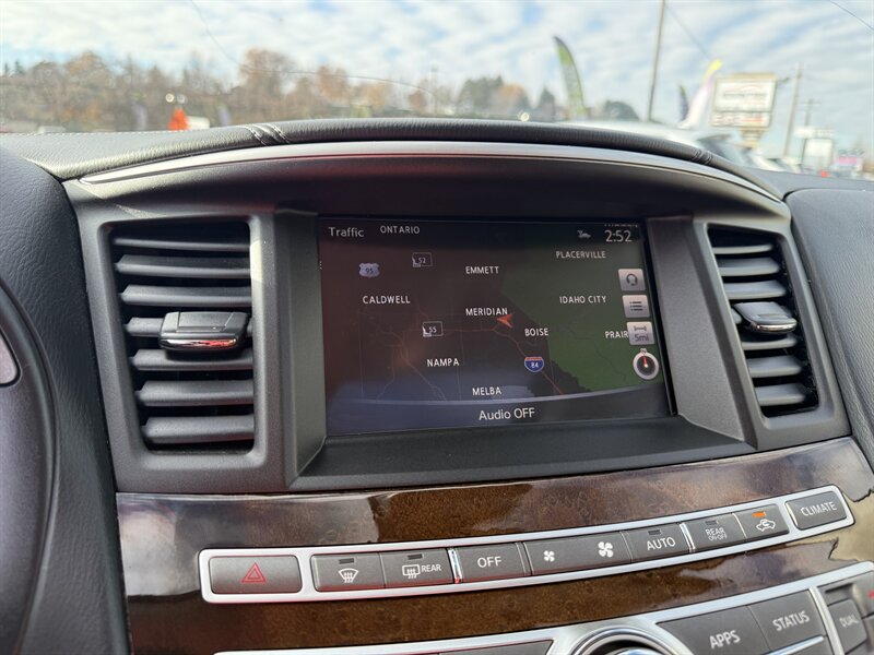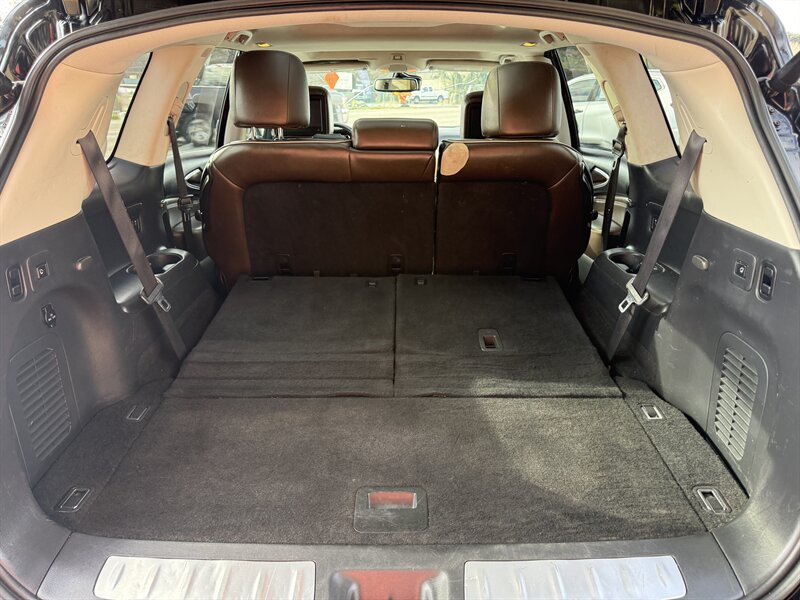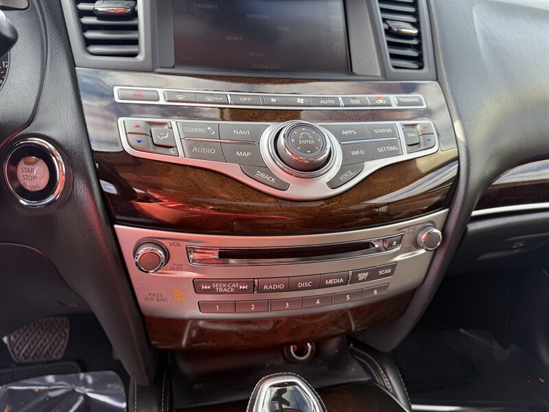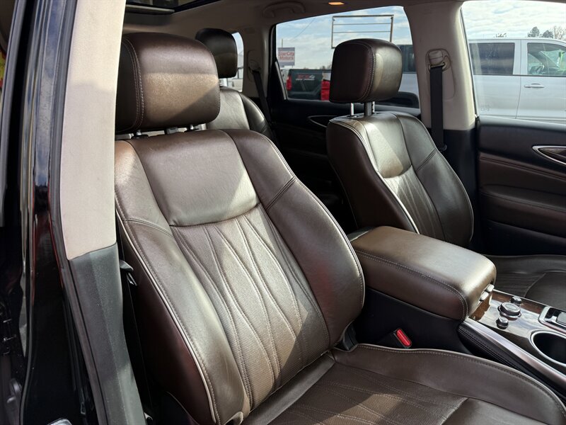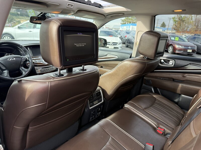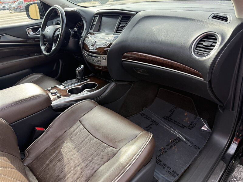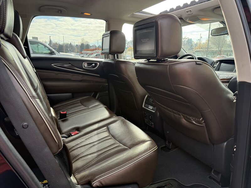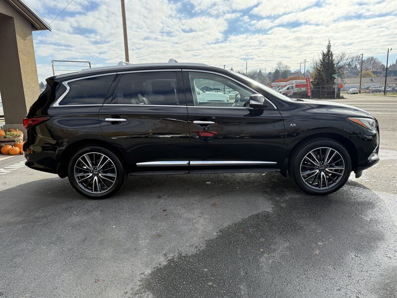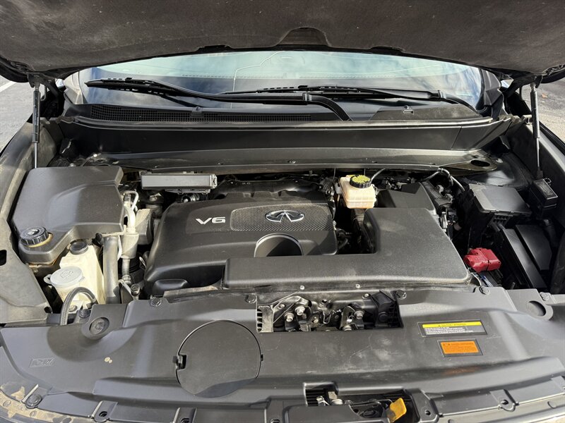 2017 INFINITI QX60 — Black Obsidian exterior, Graphite leather interior, in excellent overall condition. Powered by a 3.5L V6 producing 295 hp and 270 lb-ft of torque with Xtronic CVT, EPA-rated 19 MPG city / 26 MPG highway. Includes Driver Assistance Package (advanced safety aids such as adaptive cruise control, forward emergency braking and lane departure alerts) and Theater Package (rear-seat entertainment screens with wireless headphones). Factory features include three-row seating for up to seven, power-adjustable front seats, power liftgate, tri-zone automatic climate control, Bluetooth hands-free audio, rearview camera, USB/AUX inputs, steering-wheel audio and cruise controls, keyless entry with push-button start, and a full suite of airbags plus stability and traction control.