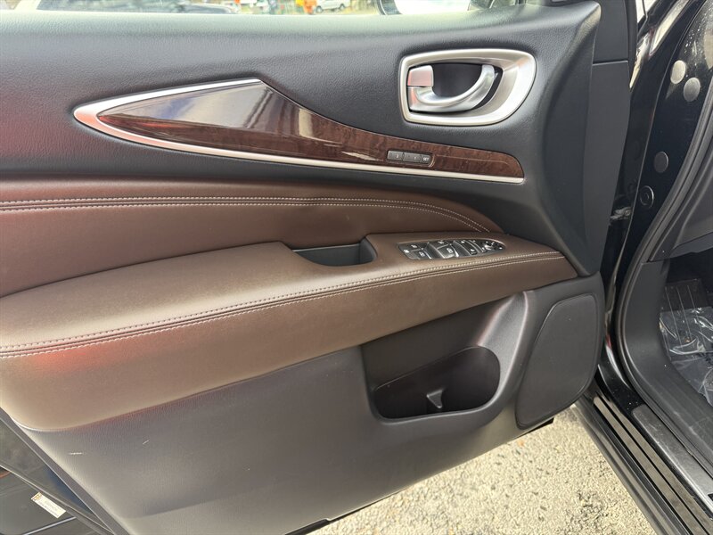 2017 INFINITI QX60 — exterior Black Obsidian, interior en cuero Graphite, en excelente estado general. Motor 3.5L V6 con 295 hp y 270 lb-ft de torque con transmisión CVT Xtronic, consumo EPA de 19 MPG ciudad / 26 MPG carretera. Incluye Paquete de Asistencia al Conductor (ayudas de seguridad avanzadas como control de crucero adaptativo, frenado de emergencia frontal y avisos de salida de carril) y Paquete Theater (sistema de entretenimiento trasero con pantallas y auriculares inalámbricos). Las características de fábrica incluyen tres filas de asientos para hasta siete pasajeros, asientos delanteros con ajuste eléctrico, portón trasero eléctrico, climatizador automático de tres zonas, Bluetooth manos libres, cámara trasera, entradas USB/AUX, controles de audio y crucero en el volante, entrada sin llave con arranque por botón y un conjunto completo de airbags junto con control de estabilidad y tracción.