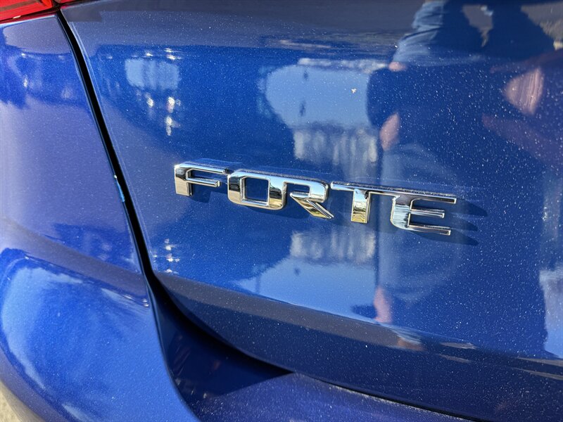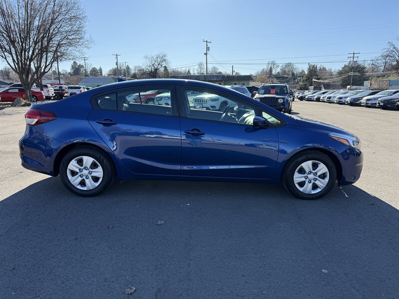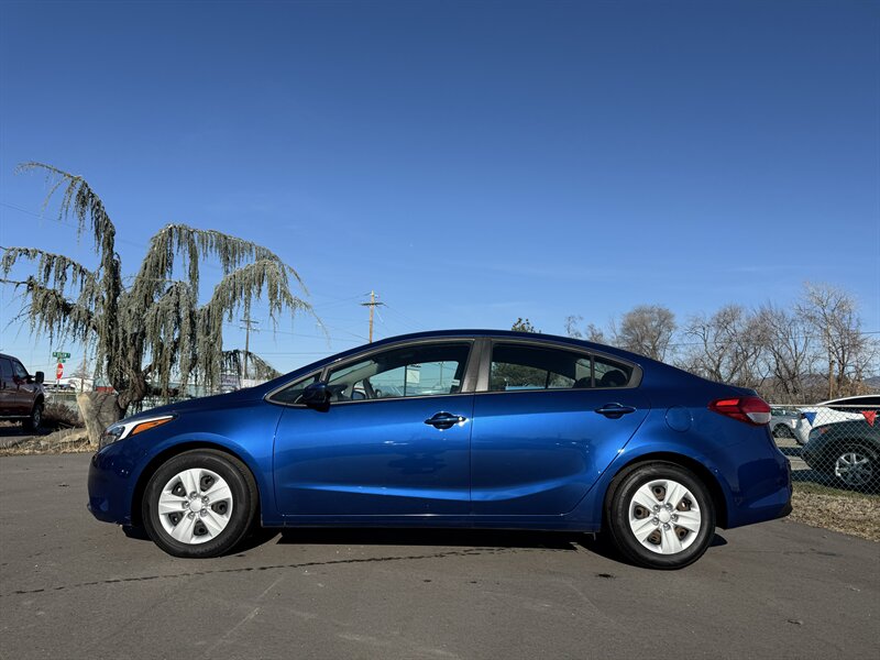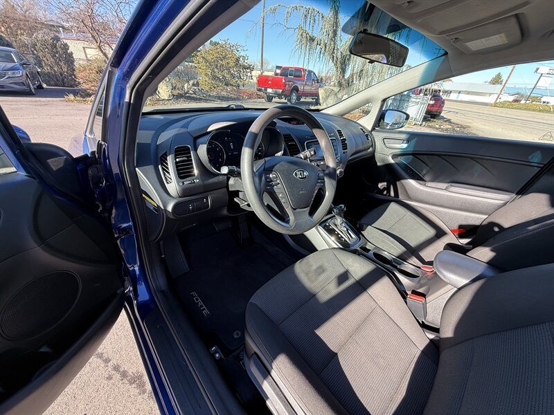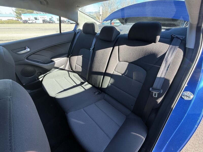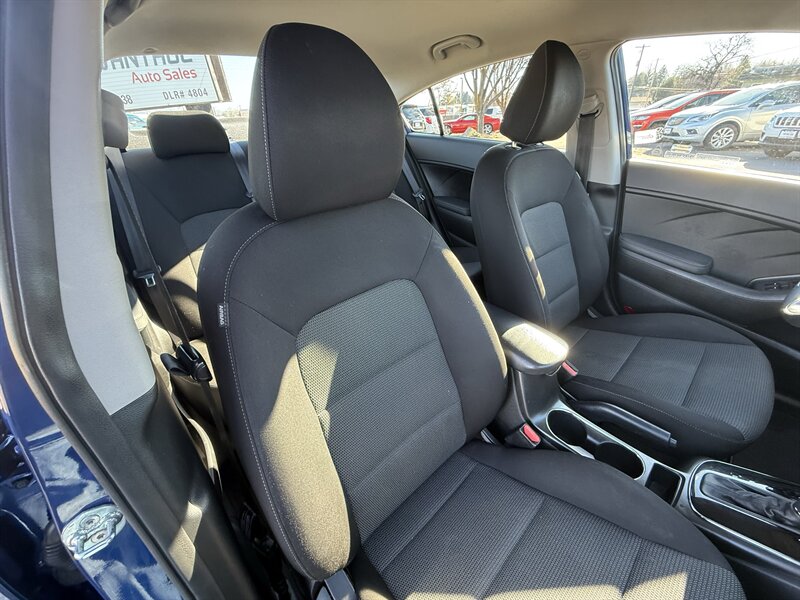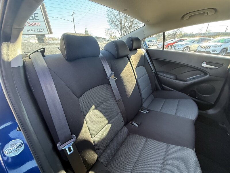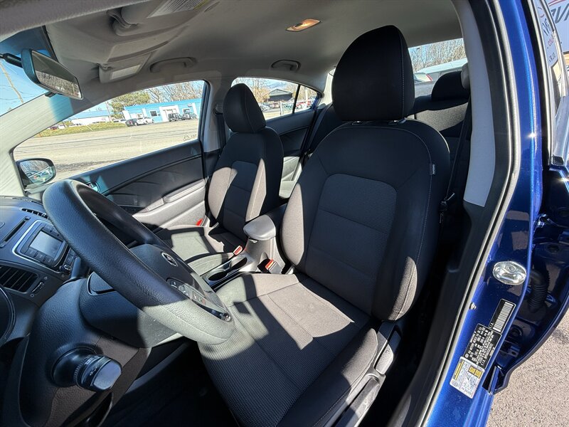 2018 Kia Forte LX in Deep Sea Blue with Black cloth interior. Powered by the Nu 2.0L I4 (147 hp, 132 ft·lb), this Forte comes with the factory standard comfort and convenience features: cloth seating with 60/40 split-folding rear seat, manual air conditioning, power windows and door locks, remote keyless entry, steering-wheel audio controls and cruise control. Infotainment includes Bluetooth hands-free and audio streaming, USB/AUX inputs and AM/FM radio. Safety features from the factory include ABS, electronic stability and traction control, multiple airbags and tire pressure monitoring, plus a rearview camera. Excellent overall condition with under 46,000 miles (averaging less than 6,000 miles/year). Fuel economy: 25 MPG city / 34 MPG highway.