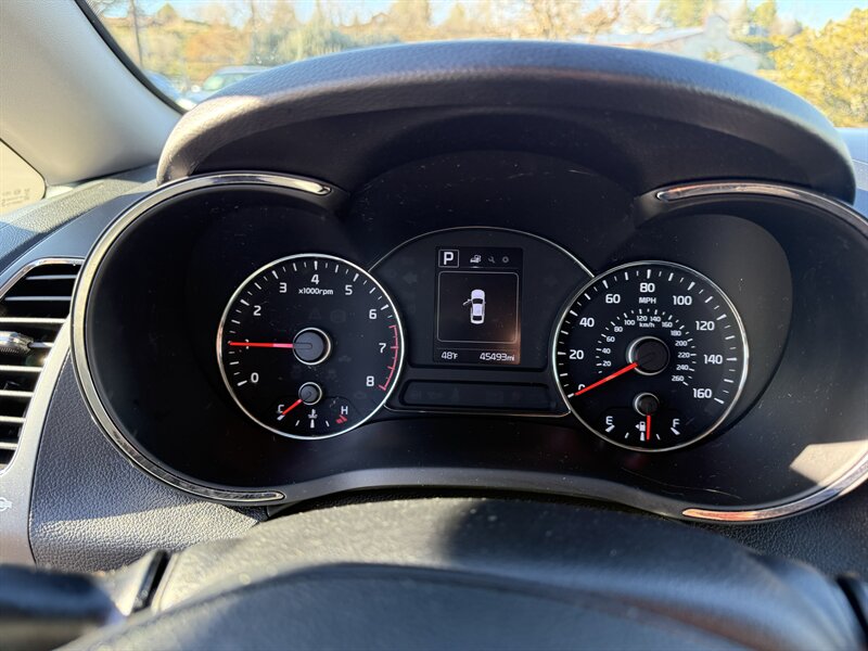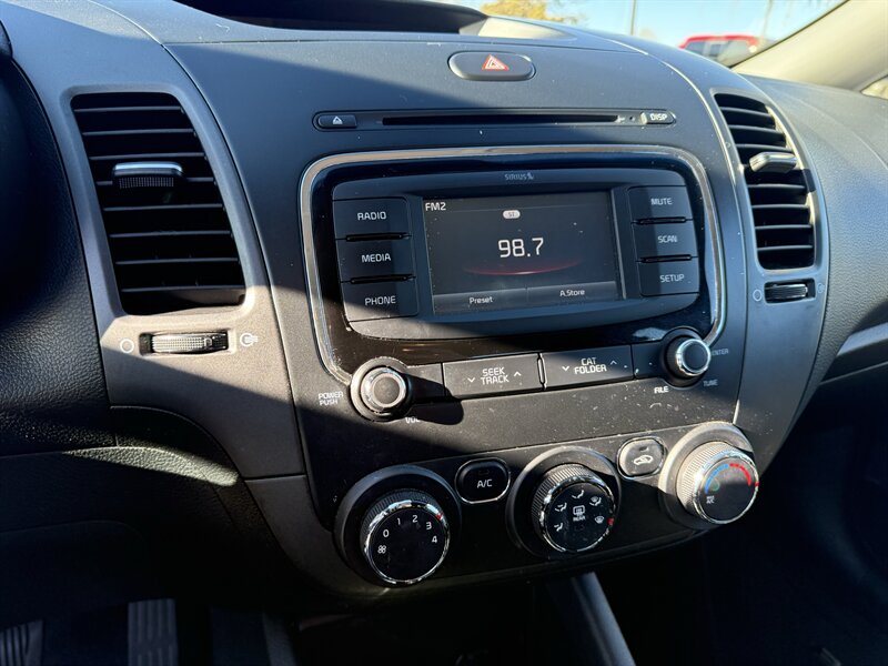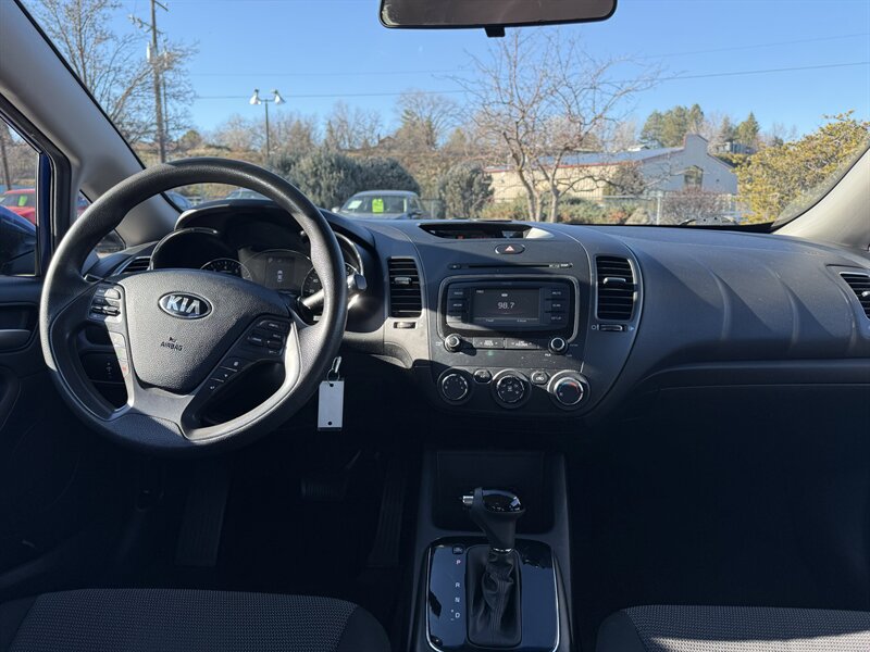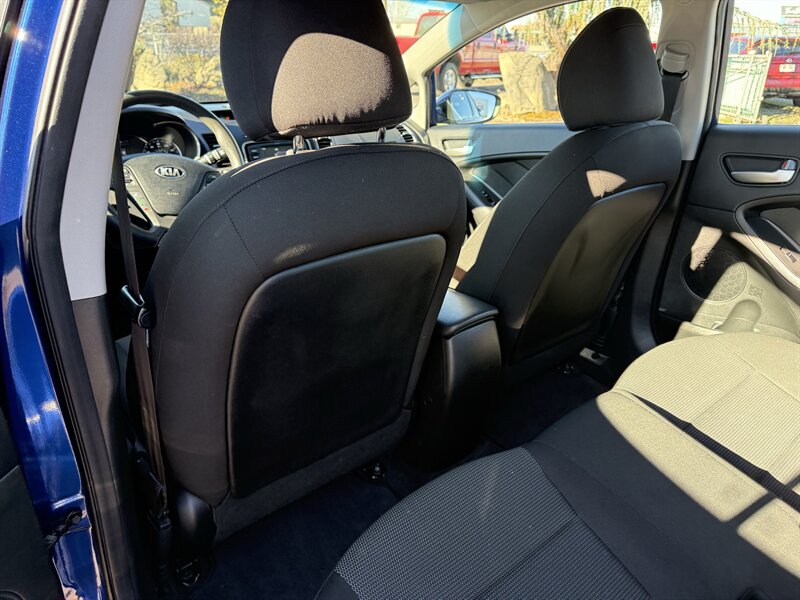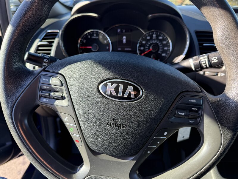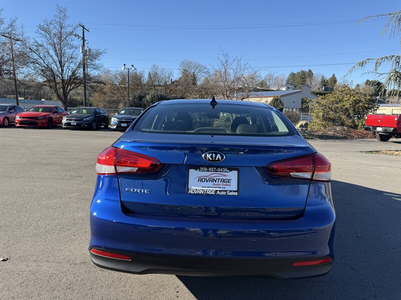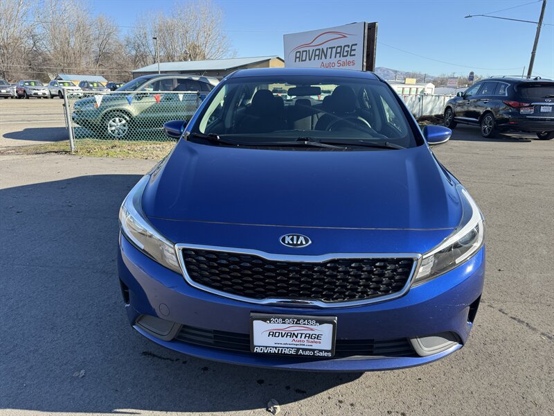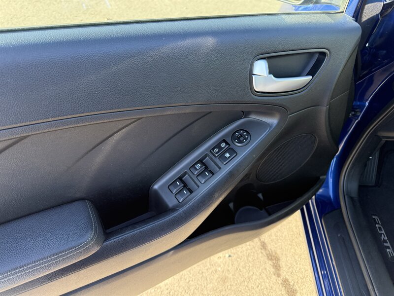 2018 Kia Forte LX in Deep Sea Blue with Black cloth interior. Powered by the Nu 2.0L I4 (147 hp, 132 ft·lb), this Forte comes with the factory standard comfort and convenience features: cloth seating with 60/40 split-folding rear seat, manual air conditioning, power windows and door locks, remote keyless entry, steering-wheel audio controls and cruise control. Infotainment includes Bluetooth hands-free and audio streaming, USB/AUX inputs and AM/FM radio. Safety features from the factory include ABS, electronic stability and traction control, multiple airbags and tire pressure monitoring, plus a rearview camera. Excellent overall condition with under 46,000 miles (averaging less than 6,000 miles/year). Fuel economy: 25 MPG city / 34 MPG highway.